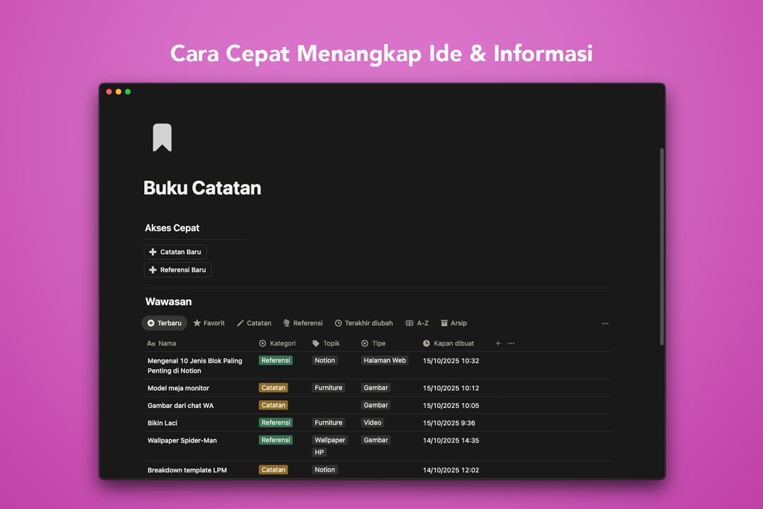 Inilah cara cepat menangkap ide dan informasi ke Second Brain di Notion. Sehingga, ide dan informasi tidak tercecer, sekaligus terorganisir dengan rapi.