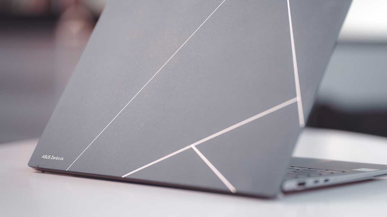 Karena masih merupakan seri yang sama, ASUS Zenbook S 13 OLED UX5304 ini punya desain yang serupa dengan UM5302. Yang paling mencolok tentu garis-garis yang ada di penutup layar. Garis-garis yang kelihatannya asimetris itu sebenarnya berasal dari logo A baru ASUS.