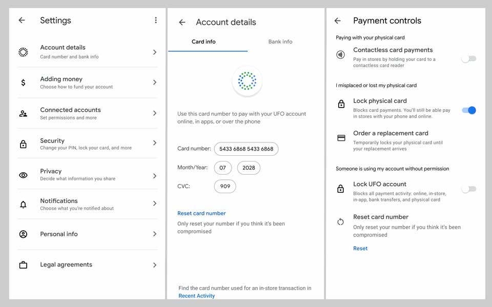 Selain fitur, aplikasi untuk kartu debit ini juga memiliki berbagai setelan dan kontrol privasi. Ada informasi akun yang memberi info kartu dan bank terkait, pilihan cara menambah dana, pilihan akun yang terhubung, keamanan, dll.
