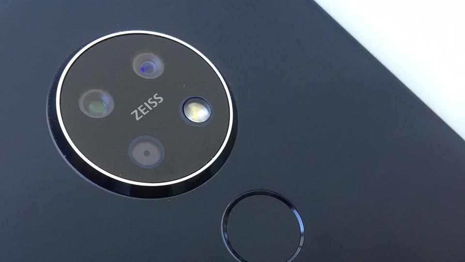 Foto itu memperlihatkan bagian belakang handphone. Terdapat tiga kamera dan satu lampu kilat di dudukan berbentuk lingkaran dengan tulisan Zeiss. Di bawahnya terdapat sensor sidik jari dan merk Nokia.