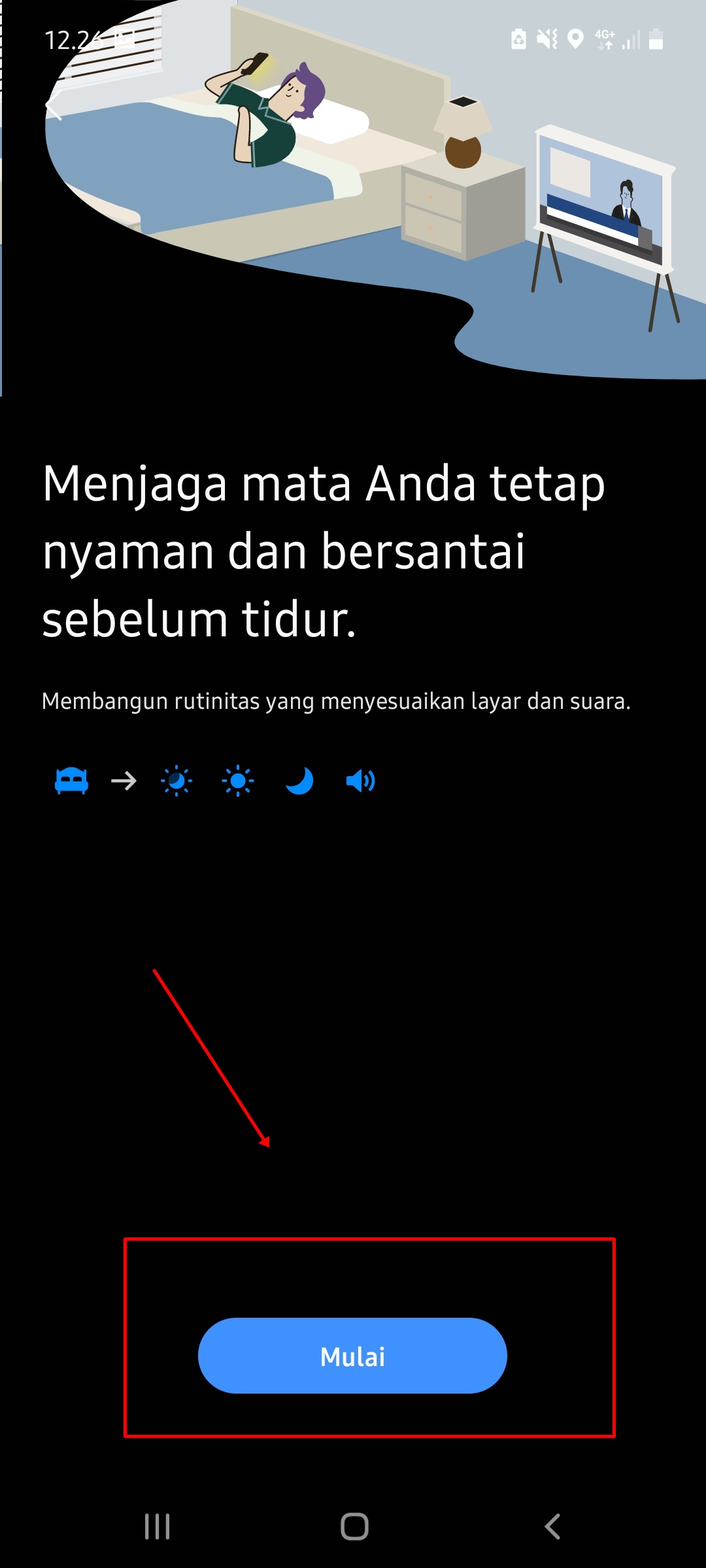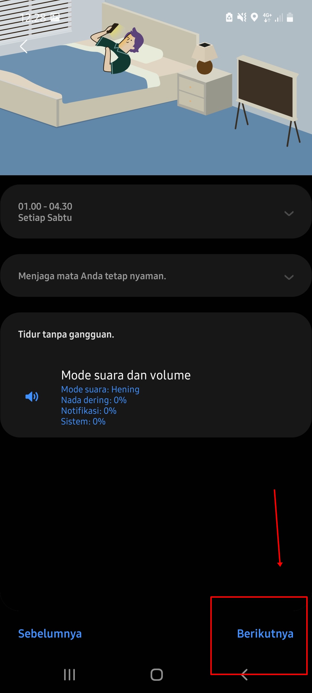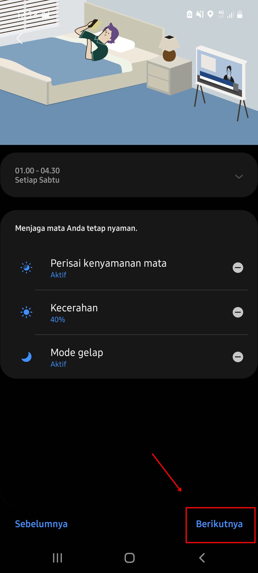 - Klik lagi tombol “Berikutnya” (di sini Bixby bakal otomatis mengaktifkan perisai mata, menurunkan kecerahan, dan mengaktifkan mode gelap).