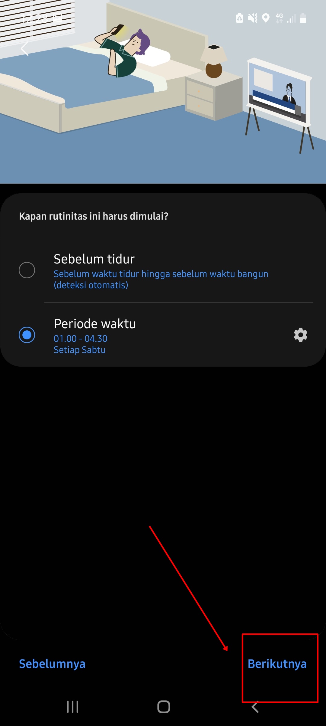 - Kalau kamu pilih “Sebelum Tidur,” maka Bixby bakal melacak waktu tidurmu dan otomatis mematikan beberapa fungsi aplikasi.