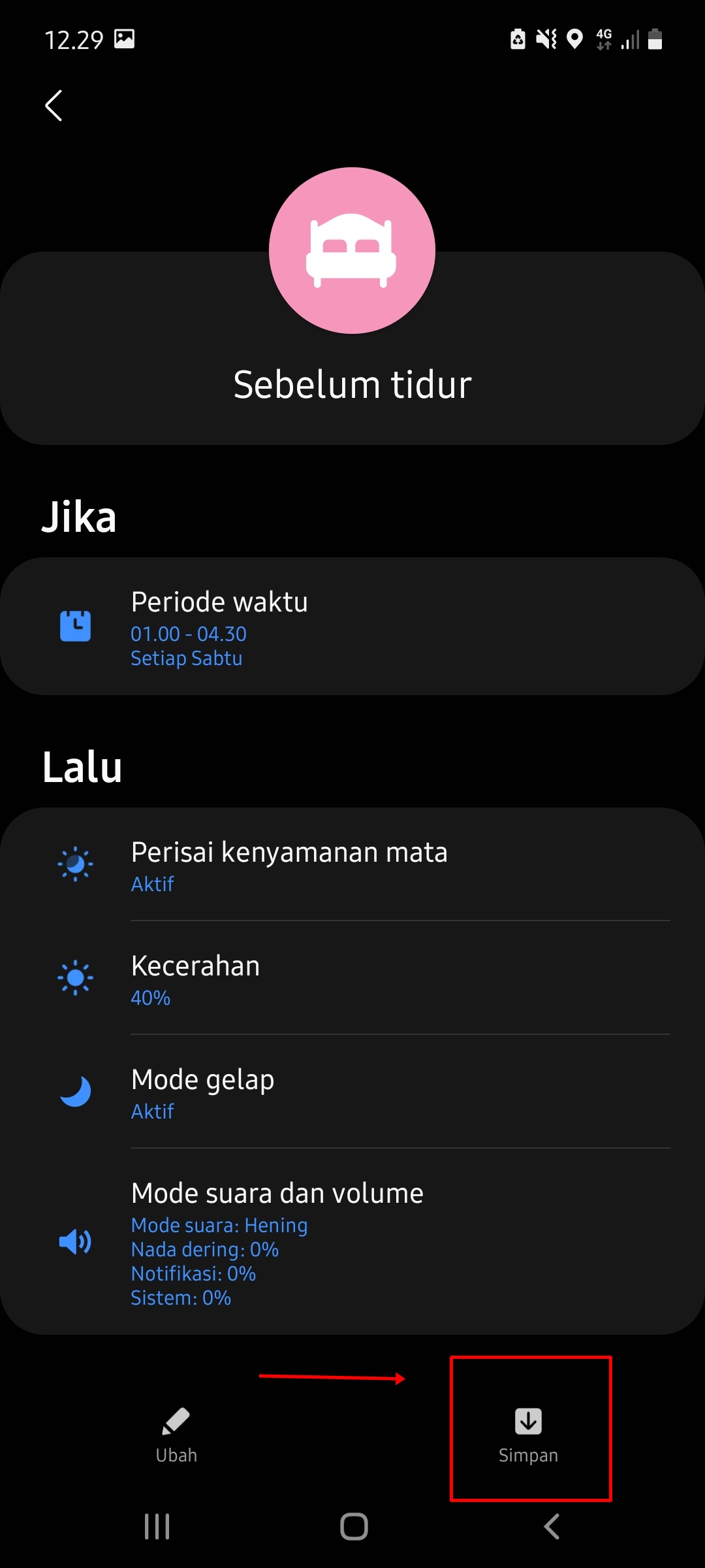 Selesai. Jadi sesuai rutinitas yang saya bikin tadi, setiap kali masuk pukul 01.00, maka ponsel akan otomatis mengaktifkan mode gelap, membisukan notifikasi, nada dering, dan sistem ponsel.