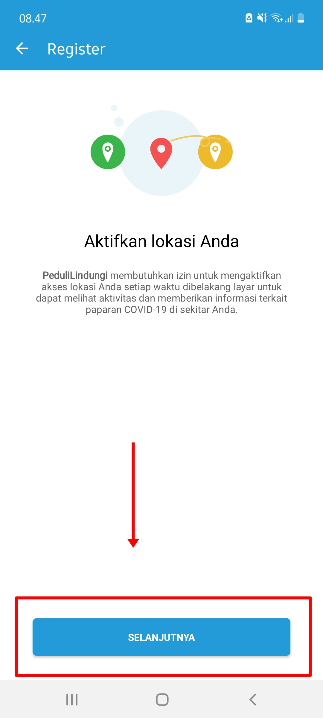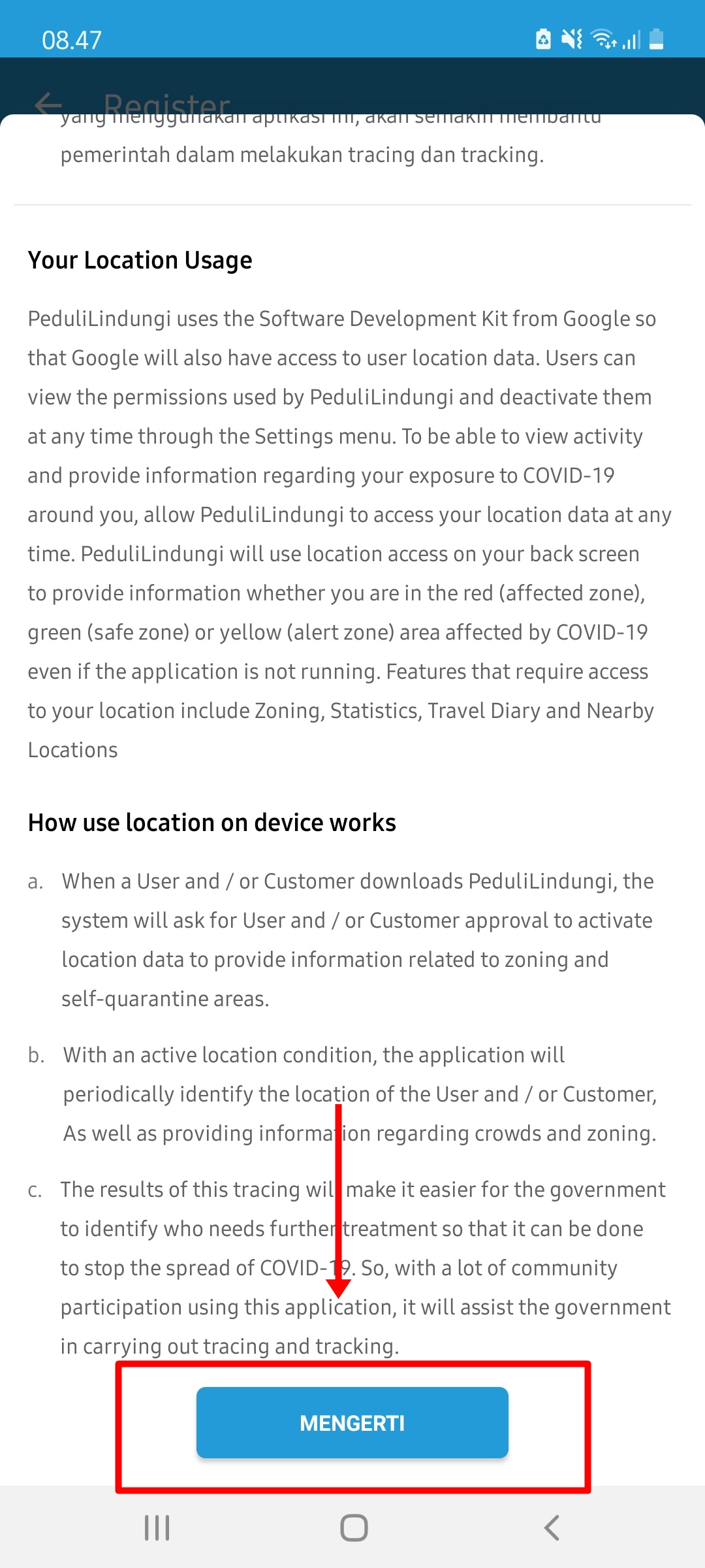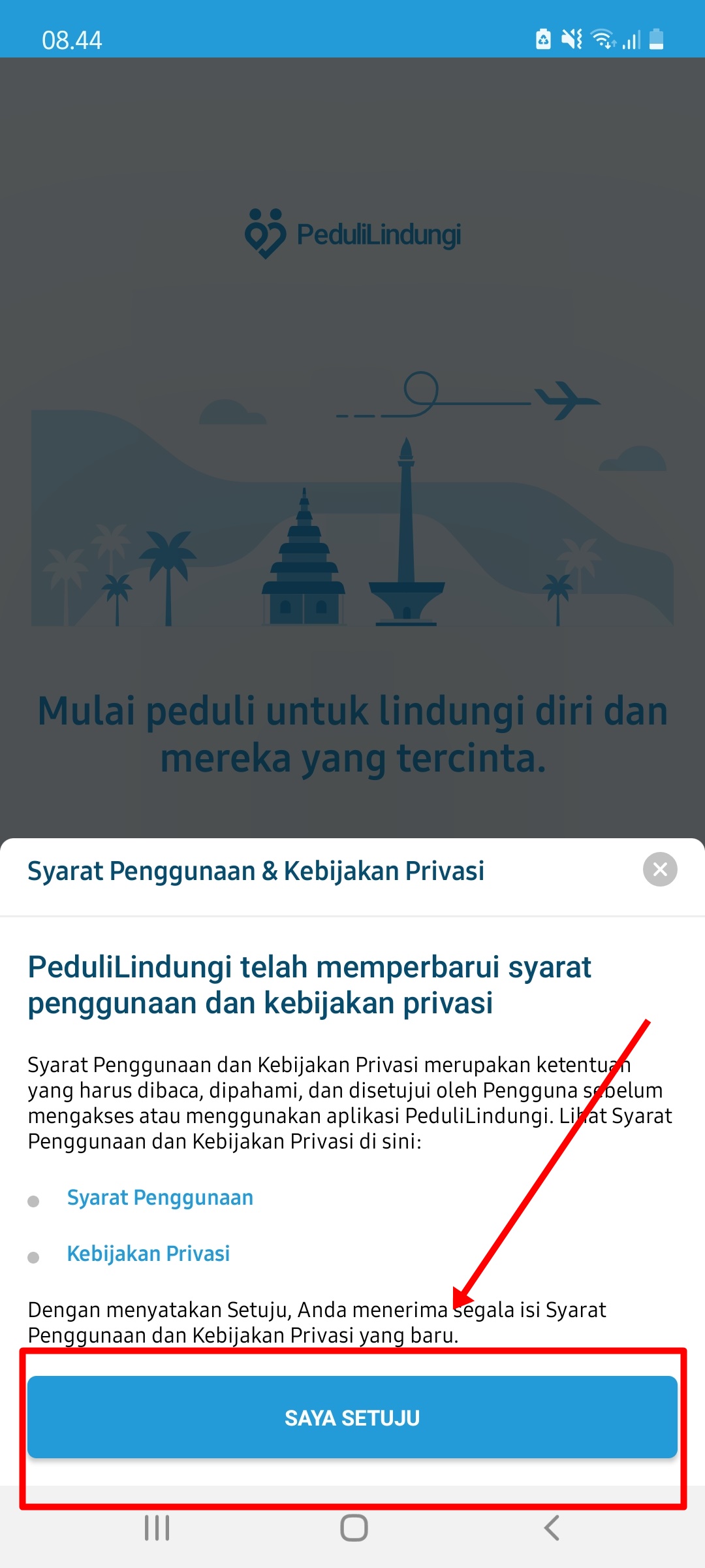 • Jangan lupa centang bagian “Saya menerima segala isi Syarat Penggunaan dan Kebijakan Privasi PeduliLindungi.”