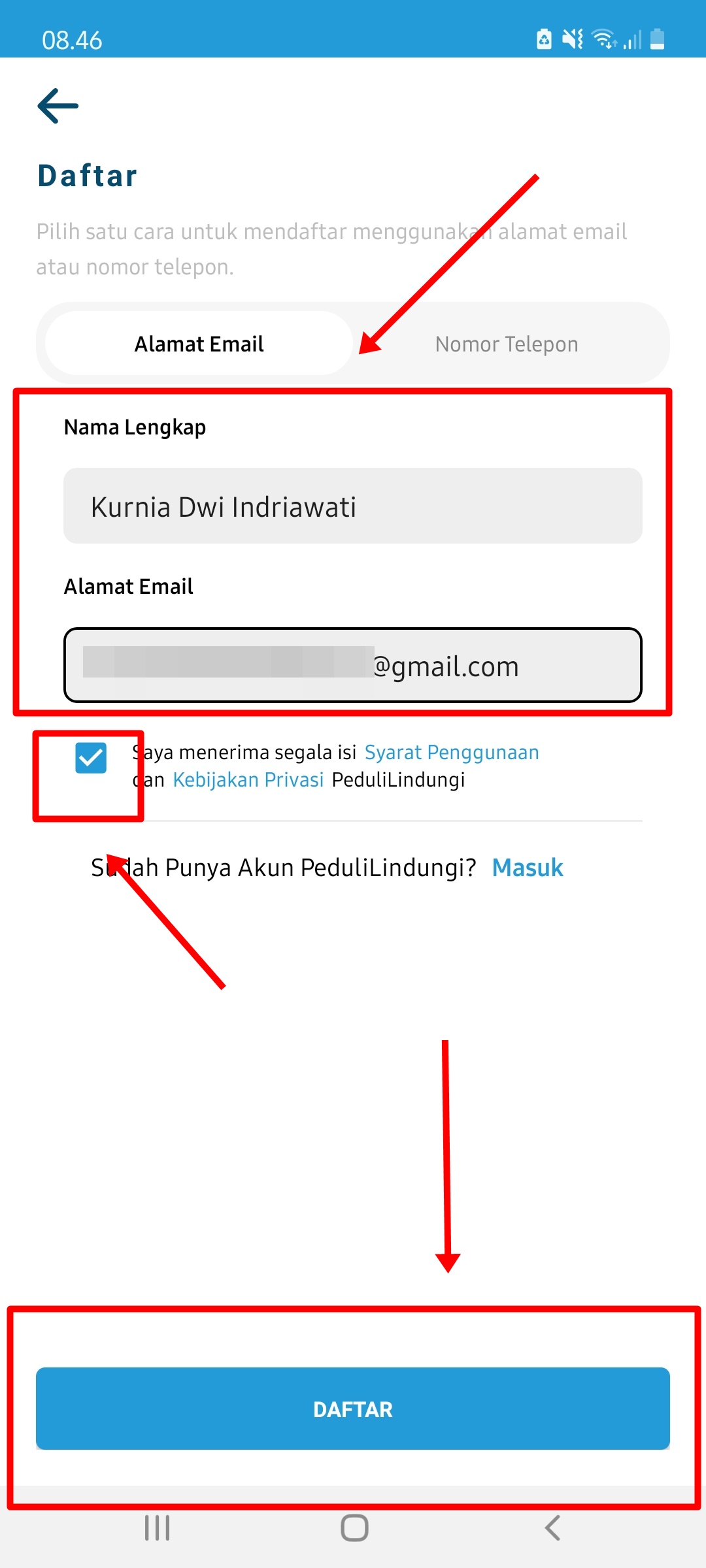 • Sebagai contoh, kali ini saya daftar akun PeduliLindungi pakai email.