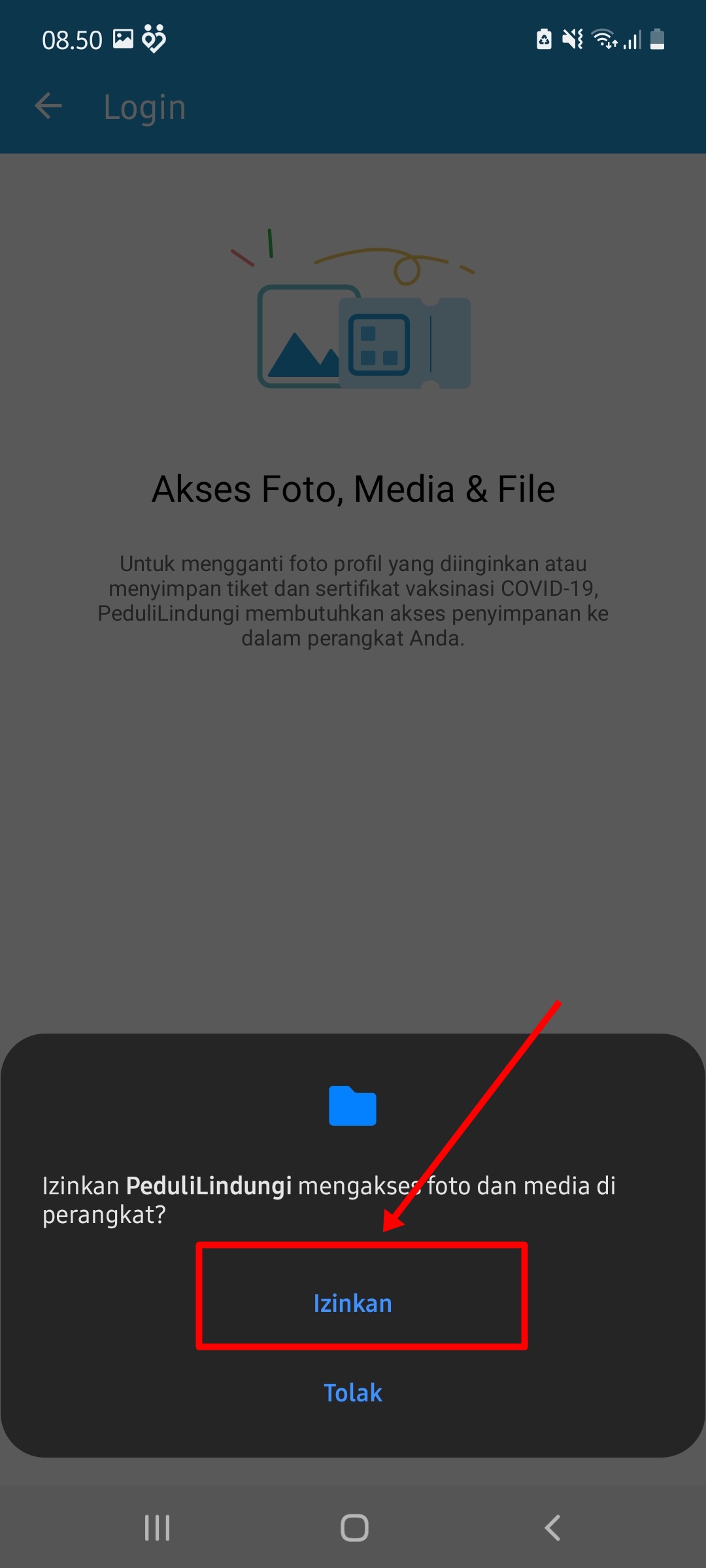 • Terakhir, klik “Izinkan” saat PeduliLindungi minta izin untuk mengakses file ponsel.