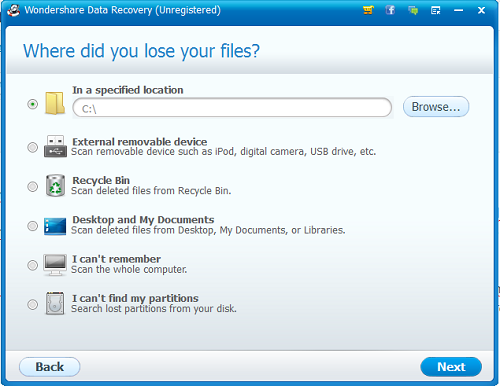 Setelah itu, pilih partisi dimana file tersebut hilang. Selain partisi hardisk dan folder Recycle Bin, Wondershare Data Recovery juga bisa mengembalikan data yang hilang dari USB flash drive atau flashdisk.