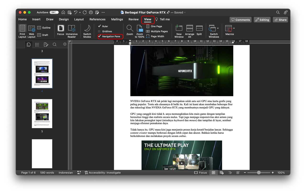 Cara lain untuk bisa memeriksa halaman dengan cepat adalah dengan menggunakan fitur Navigation Pane (Panel Navigasi). Dengan panel ini, kamu bisa menelusuri halaman yang ada, dan bisa langsung menuju halaman tertentu. Ibaratnya seperti daftar isi tapi dengan gambar.