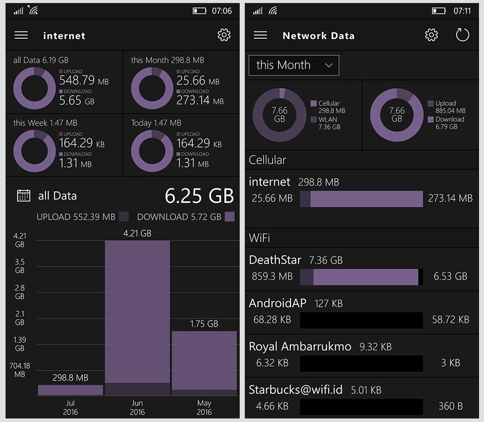Selain itu, kita bisa melihat informasi melalui data seluler atau wi-fi apa saja, beserta keterangan jumlah transfer datanya. Informasi itu masih dilengkapi lagi dengan statistik penggunaan tiap koneksi (bulan lalu berapa giga, bulan ini berapa giga).