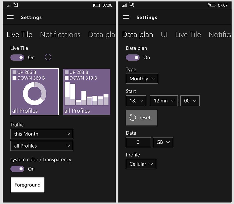 Live tile aplikasi ini lebih menarik daripada Data Usage. Kita bisa memilih informasi apa yang ingin kita lihat, dan bagaimana tampilan live tile. Di samping live tile, aplikasi Network Data juga menyediakan notifikasi sebagai pengingat.