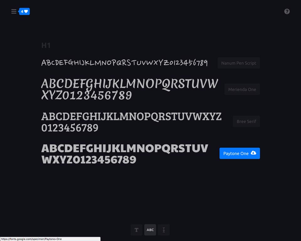 Kalau sudah puas, akses koleksi font itu lewat menu di pojok kiri atas (ada tandanya). Di sini, kamu bisa melihat jajaran font pilihanmu dengan tulisan yang kamu buat. Tapi kamu juga bisa melihat daftar alfabet kalau kamu ingin cek bentuk huruf lainnya.