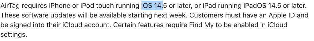 Seperti ditunjukkan oleh Joanna Stern dari Wall Street Journal, siaran pers untuk AirTag mencantumkan kalau AirTag membutuhkan iPhone atau iPad yang memakai iOS 14.5 dan pembaruan itu akan mulai hadir minggu depan.