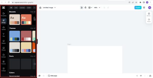 Kamu bisa melihat berbagai pilihan, termasuk template desain, teks, bentuk, stiker, bingkai, dll. di sisi samping. Pilih desainnya terlebih dahulu, lalu mulailah mengedit gambar dengan memanfaatkan berbagai fitur yang ada.