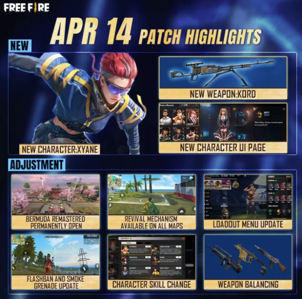 Pembaruan ini juga menampilkan daftar lengkap tentang penyesuaian penyeimbang antara karakter dan senjata. Rasakan juga Bermuda remaster yang telah diperbarui atas permintaan pemain Free Fire selama ini.