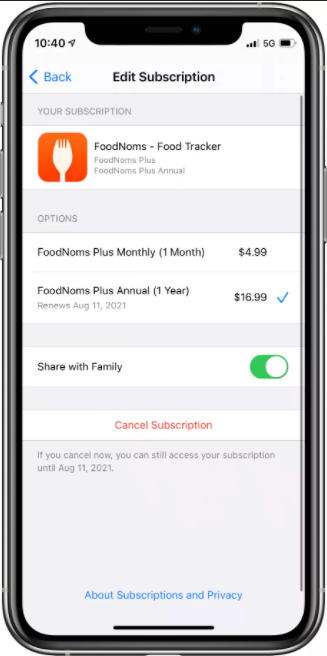 Apabila kalian mengetuk salah satu aplikasi, kalian akan dibawa ke halaman ‘Edit Subscriptions.’ Di sana kalian dapat melihat tombol ‘Share with Family’ (jika pengembang sudah mengizinkannya).