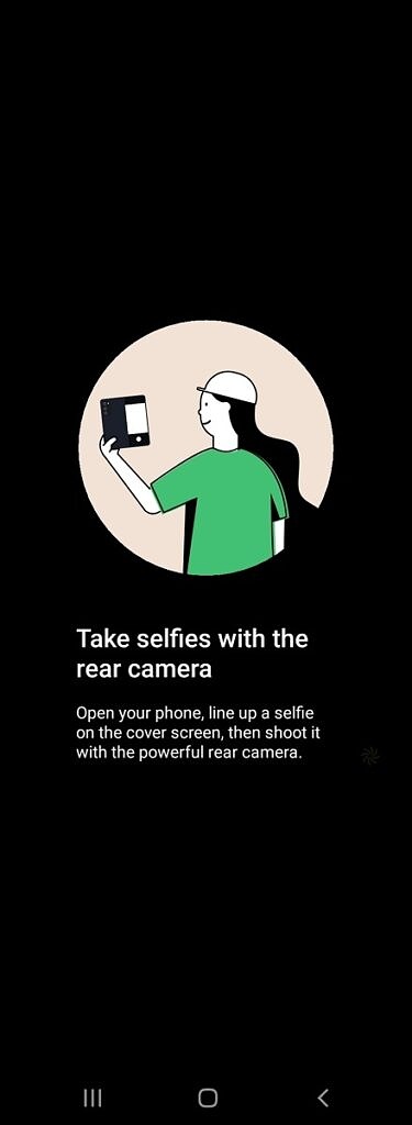 Kamu cuma perlu membuka aplikasi Kamera dari cover display. Setelah itu, klik tombol “Selfie” yang ada di sudut kanan atas layar.