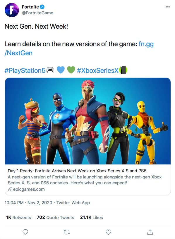 Sementara itu, Fortnite versi next-gen akan diluncurkan pada 10 November 2020 (untuk Xbox Series X dan Xbox Series S). Kemudian diluncurkan tanggal 12 November 2020 untuk PlayStation 5.