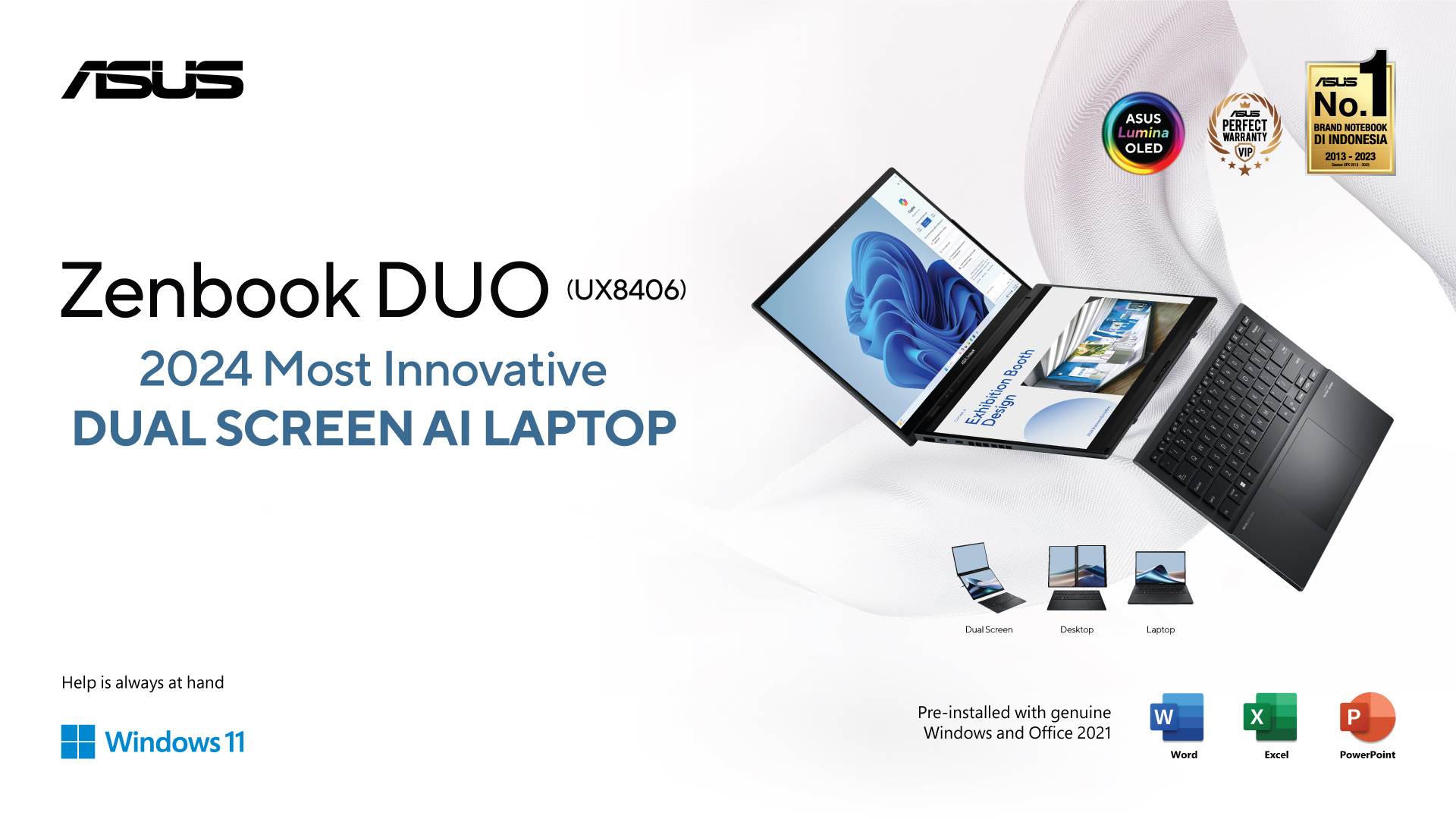 ASUS Zenbook DUO (UX8406) merupakan sebuah laptop revolusioner dengan dua layar touchscreen ASUS Lumina OLED 3K 120Hz yang dirancang untuk meningkatkan produktivitas. Pengguna bisa memiliki lima skenario penggunaan yang fleksibel.