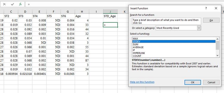 - Pada ‘Select a Function,’ scroll ke bawah sampai menemukan opsi ‘STDEV.’