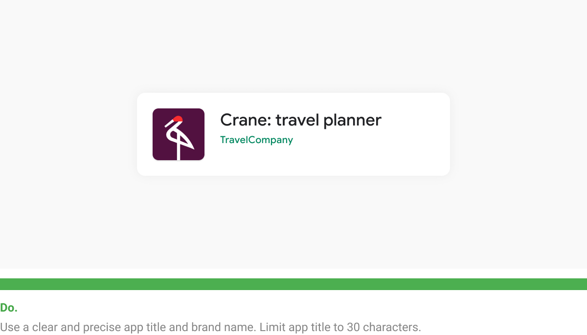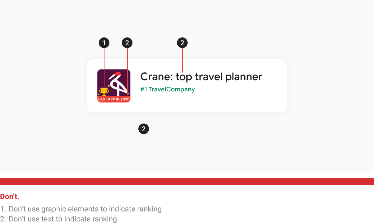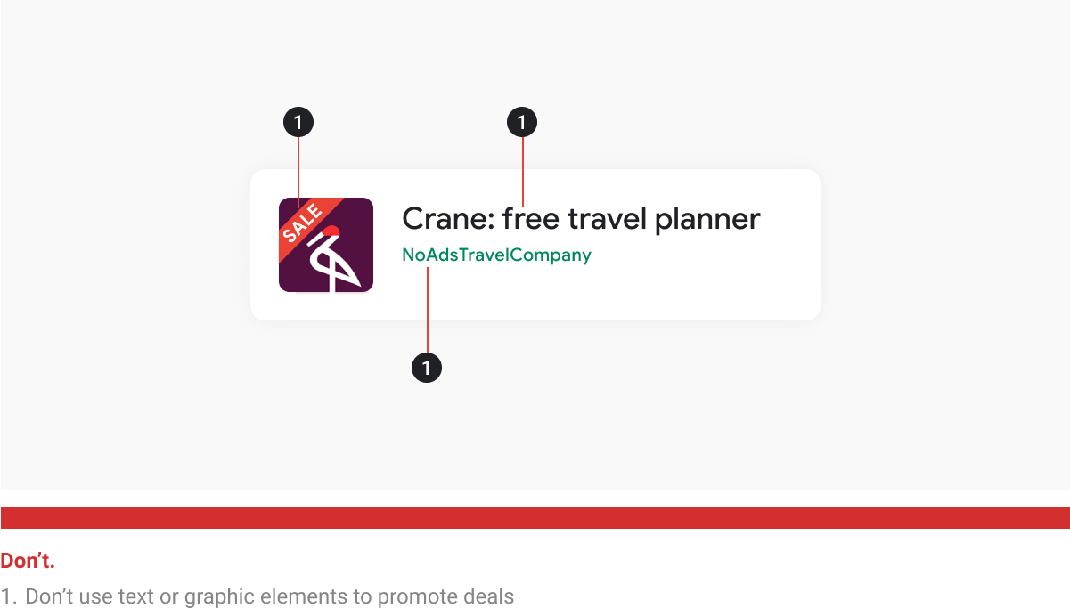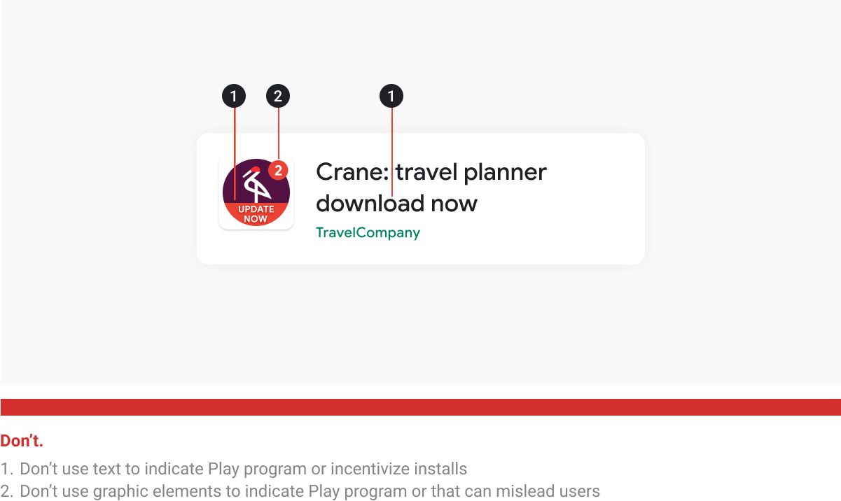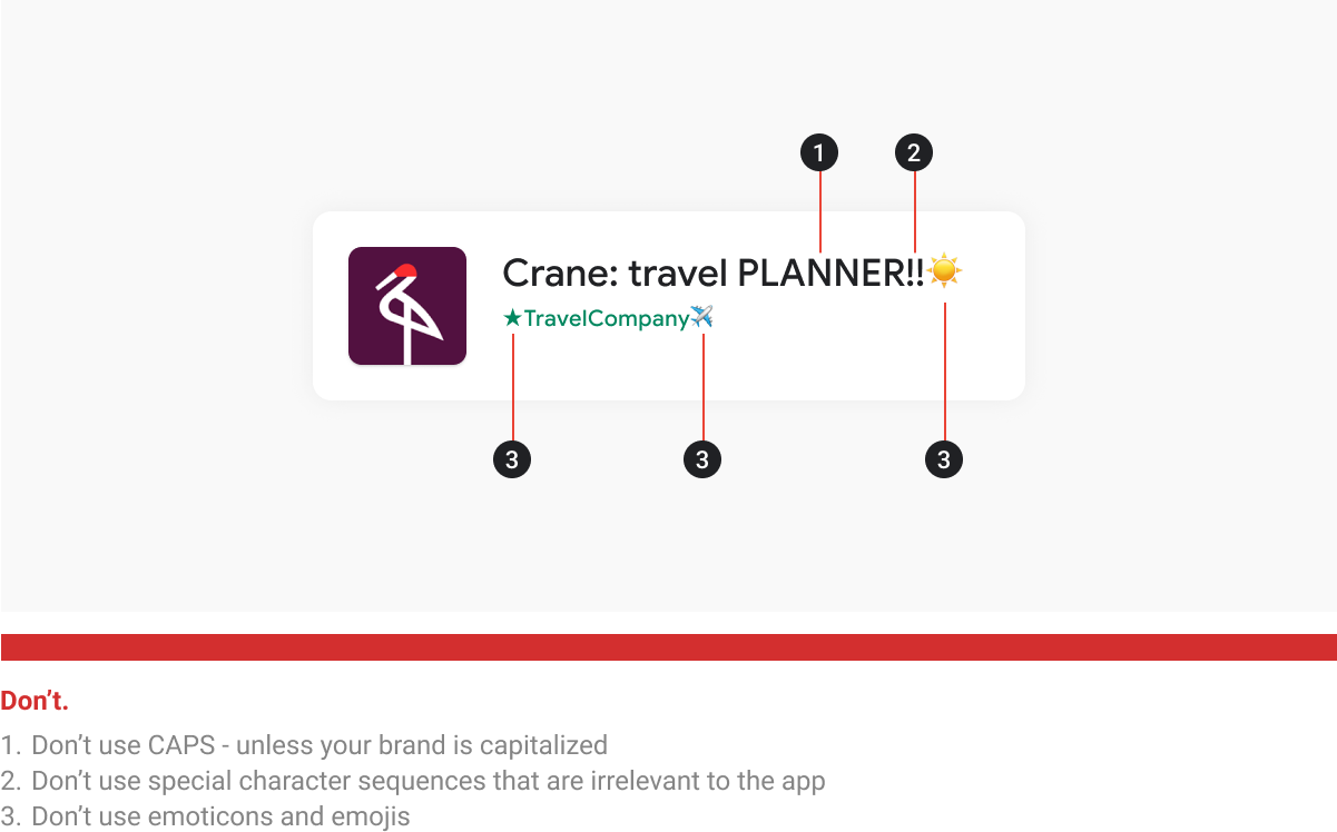 Selain itu, Google juga menunjukkan contoh praktek yang salah dalam beberapa skenario. Misalnya yang meletakkan kata “free”, “top”, “download now” di nama, atau menambah tulisan “sale” atau gambar piala di ikon aplikasi.