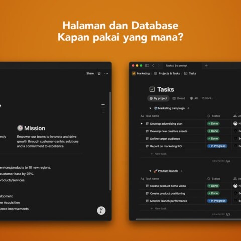 Di sini kami mengajak Anda melihat pemakaian halaman beserta database di Notion. Termasuk beda database inline dan full page, juga penggunaan praktisnya: kapan harus pakai yang mana.