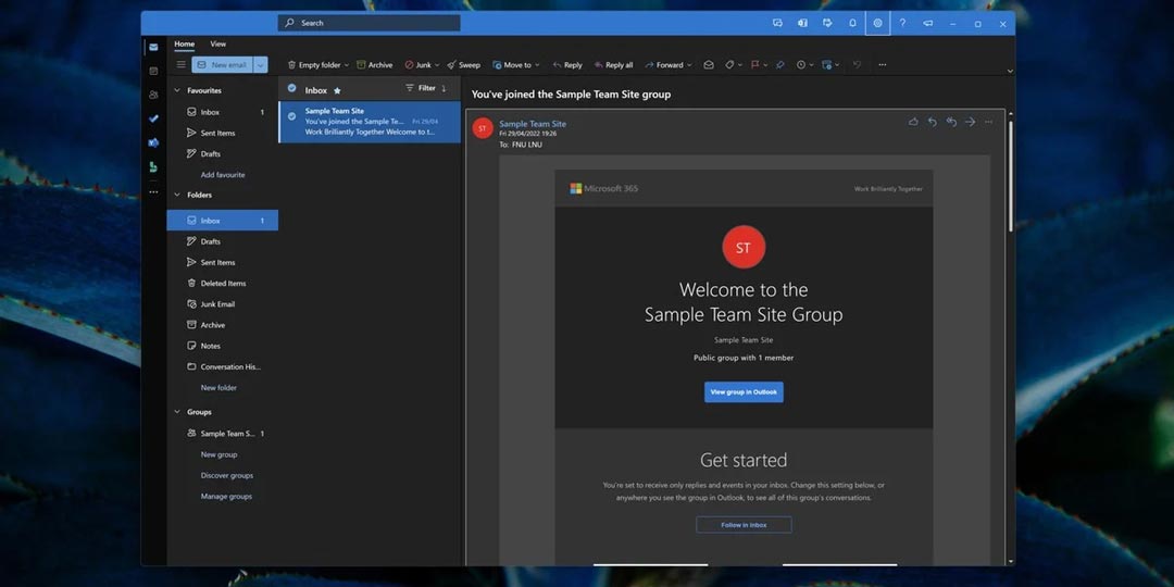 Sama seperti jika membuka Outlook di browser, aplikasi yang sedang diuji coba ini menampilkan daftar aplikasi yang terintegrasi di bagian samping kiri. Baru kemudian, ada menu yang bisa disembunyikan, inbox, dan tampilan isi email. Selain itu, kamu juga bisa melihat jajaran ikon aplikasi di bagian header di samping kotak pencari.