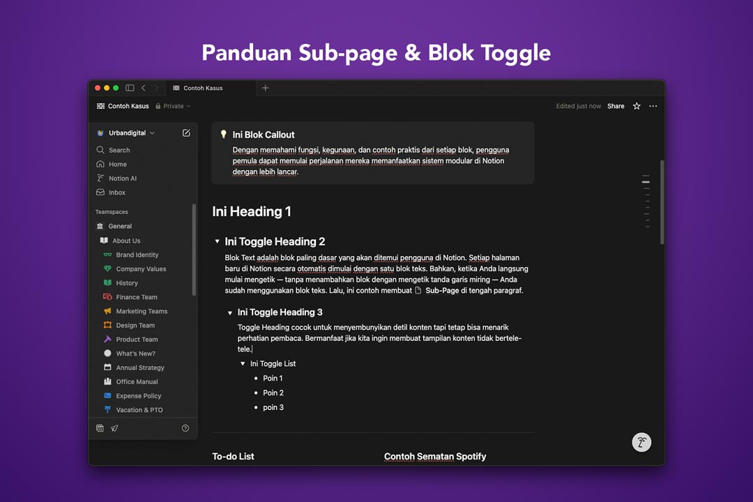 Di sini kami membahas beberapa fitur yang memungkinkan Anda merapikan konten di dalam workspace (ruang kerja) Notion Anda, yaitu: Sub-page dan Toggle. Kedua fitur ini memiliki fungsi yang mirip, yaitu membuat Anda lebih fokus pada hal tertentu di ruang kerja.