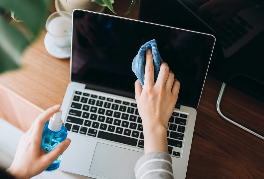 Bagaimana kalau layar laptop terciprat minyak dari gorengan yang kamu makan? Tenang, kamu bisa semprotkan cairan pembersih khusus layar ke kain microfiber kering, setelah itu usap layar pakai kain microfiber tadi.