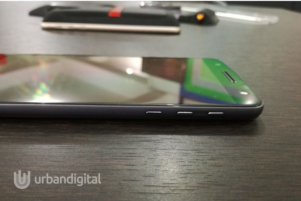 Pada bagian depan, kalian akan melihat sensor, speaker (untuk keperluan telepon) dan kamera depan berada di bagian atas. Sedangkan pada bagian bawah, ada microphone dan sensor sidik jari yang menurut saya agak aneh.